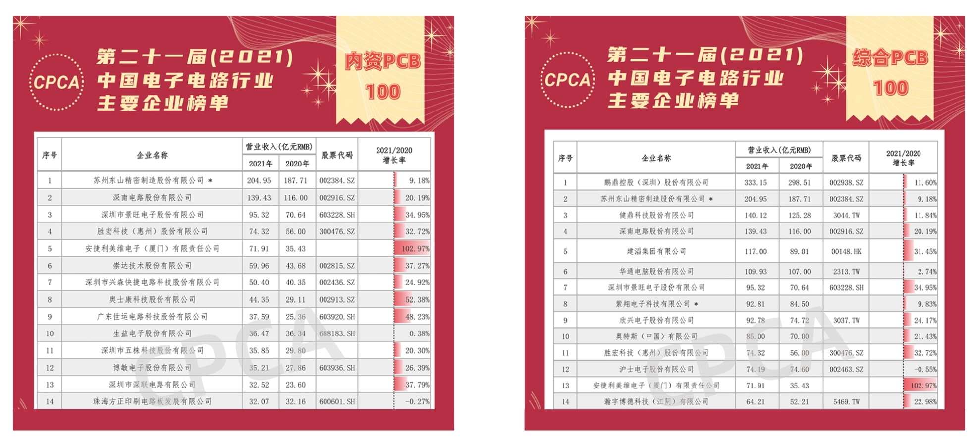 5月18日,由中国电子信息行业联合会和中国电子电路行业协会联合发布的第二十一届(2021)中国电子电路行业主要企业榜单正式发布。榜单中设有综合PCB百强企业排行、内资PCB百强企业排行、覆铜箔板企业排行等10个子榜单,共计有241家企业上榜。其中九游ninegame科技以74.32亿元的营收位居中国综合PCB榜单第11名,内资第4名。