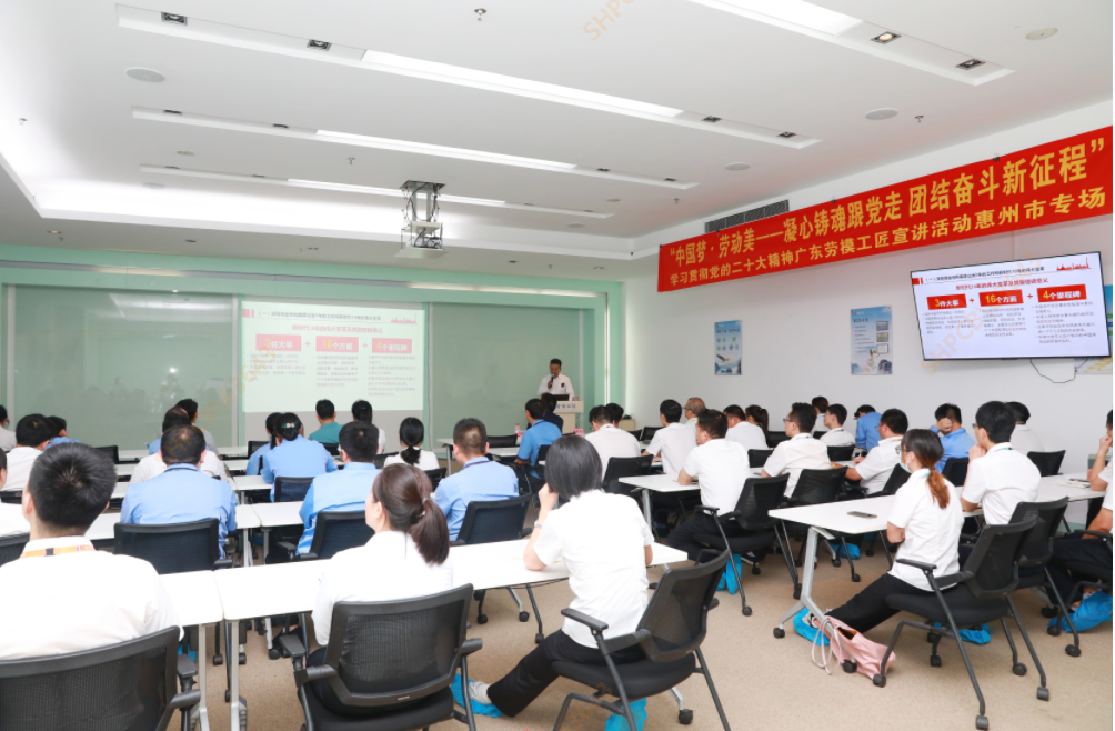 为深入学习宣传贯彻党的二十大精神,切实引领广大职工群众在新时代新征程上踔厉奋发、勇毅前行。5月16日晚,"中国梦·劳动美一凝心铸魂跟党走、团结奋斗新征程”学习贯彻党的二十大精神广东劳模工匠宣讲活动走进九游ninegame科技。宣讲会由党的二十大代表、学习贯彻党的二十大精神市委宣讲团成员、中海油惠州石化有限公司技能专家高东斌授课,惠州市总工会组宣部部长李伟宏,组宣部高俊华、惠阳区总工会副书记钟耀辉、组宣部负责人米天平、公司工会主席/采购中心总监杨峰伟以及各中心/事业部代表50余人参加。