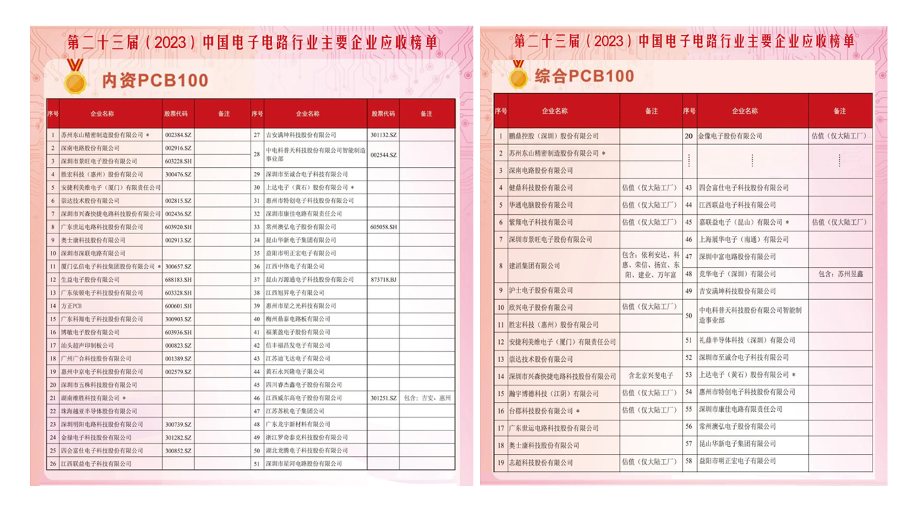 近期,中国电子电路行业协会(CPCA)正式发布了《第二十三届(2023)中国电子电路行业主要企业营收榜单》。九游ninegame科技凭借稳健坚韧的市场表现与综合实力荣登2023年度内资PCB百强榜单第4名,同时在综合PCB排名中位列第11名。